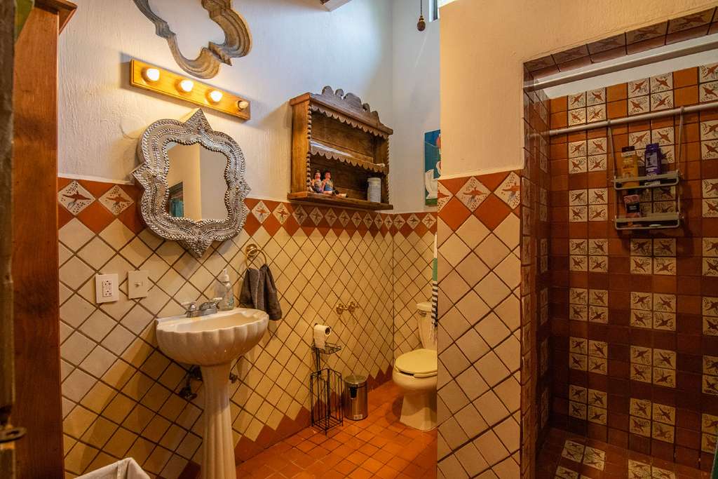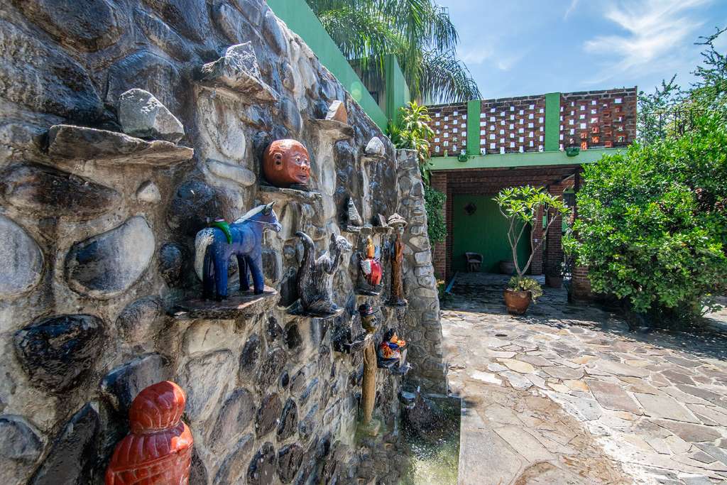 La propiedad tiene mucho carácter con toques mexicanos en cada rincón, complementada por un muro llorón en el patio trasero, añadiendo un toque de serenidad con el suave sonido del agua fluyendo.